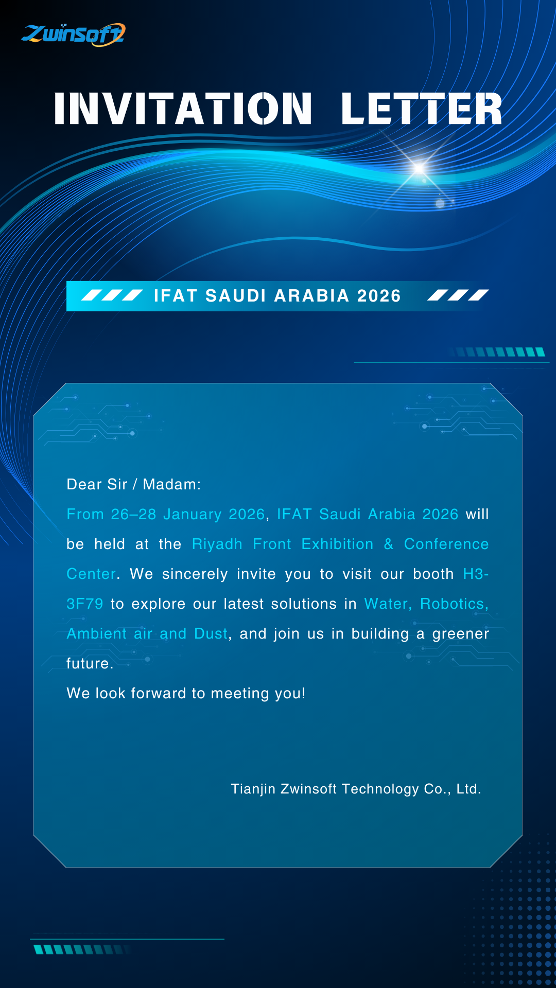 From 26–28 January 2026, the inaugural IFAT Saudi Arabia 2026 will be held at the Riyadh Front Exhibition & Conference Center. As the most influential environmental trade fair in the Middle East and North Africa, the event zeroes in on water infrastructure, wastewater treatment, solid-waste management, and air-pollution control, driving forward regional eco-development and sustainability. Zwinsoft cordially invites you to visit our stand H3-3F79 to explore our latest technologies and products in person and discuss future cooperation.
